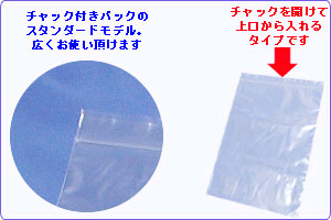 「チャック付きパック・ノーマルシリーズ」は、チャック付きパックのスタンダードモデルです。一般の小売店やスーパーなどでも重宝されているモデルです。 1000枚という低ロットで、どこよりも低価格で販売します。 チャックを開いて中身を封入し、さらに上口の部分を、卓上シーラー「FR-300L」などの溶着シーラーで密封すれば、商品としても非常に良い見栄えになります。 ※水気のある食品のパックには向きません。 「チャック付きパック・食品タイプ」をご覧下さい。